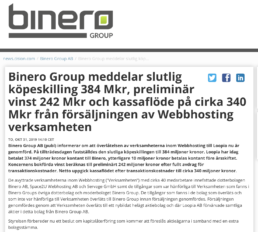 Binero Group meddelar slutlig köpeskilling 384 Mkr, preliminär vinst 242 Mkr och kassan fylls på med cirka 340 Mkr från försäljningen av Webbhosting verksamheten.Läs mer här